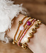 Armband aus elastischem Band mit (vergoldeten) Edelstahlanhängern und 3 Kleeblättern. Die Armbandgröße ist für ein Handgelenk straff gemessen von 16 bis 18,5 cm. Das Material bleibt auch nach dem Duschen schön. Es ist natürlich besser, es abzustreifen.