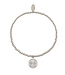 Armband aus elastischem Material mit (vergoldeten) Edelstahlperlen und charm. Die Armbandgröße ist für ein Handgelenk von 16 bis 18,5 cm eng gemessen. Das Material bleibt auch nach dem Duschen schön. Abnehmen ist natürlich immer besser.