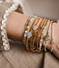 Armband aus elastischem Material mit (vergoldeten) Edelstahlperlen und charm. Die Armbandgröße ist für ein Handgelenk von 16 bis 18,5 cm eng gemessen. Das Material bleibt auch nach dem Duschen schön. Abnehmen ist natürlich immer besser.