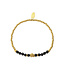 Armband auf Elastik aufgezogen. Die Perlen sind aus (vergoldetem) Edelstahl. Die Zwischensteine sind schwarz und aus Edelstein. Die Armbandgröße ist für ein Handgelenk von 17 bis 18,5 cm. Entspricht Größe M.