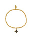 Armband aus elastischem Material mit (vergoldeten) Edelstahlperlen und charm. Die Armbandgröße ist für ein Handgelenk von 16 bis 18,5 cm eng gemessen. Das Material bleibt auch nach dem Duschen schön. Abnehmen ist natürlich immer besser.