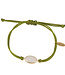Armband aus weichem grünen Band mit einem weißen Glasstein und (vergoldeter) Verarbeitung. Das Armband ist in der Größe leicht verstellbar.