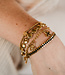 Bracelet threaded on elastic with beads made of (gold-plated) stainless steel and 3 squares. The bracelet is suitable for a wrist size measured tightly from 16 to 18.5 cm. The material remains beautiful even after showering. It is of course always better
