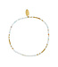 Bracelet threaded on elastic with beads of (gold-plated) stainless steel and a beautiful charm. The bracelet is tightly measured for a wrist size of 16 to 18.5 cm. The material remains nice even after showering. However, it is always better to take it off
