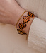 The bracelet is made of (gold-plated) stainless steel. It is made of high-quality materials, but be careful with products such as perfume, sunscreen, and body lotion. Suitable for a wrist size between 16 and 18.5 cm. This bracelet is adjustable in size.