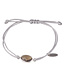 Armbandje gemaakt van zacht koord in het grijs met steen grijs van glas met (verzilverd) bewerking. Armbandje is makkelijk verstelbaar in maat.