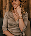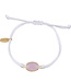 Armbandje gemaakt van zacht koord in het wit met steen van glas in het roze met (vergulde) bewerking. Armbandje is makkelijk verstelbaar in maat.